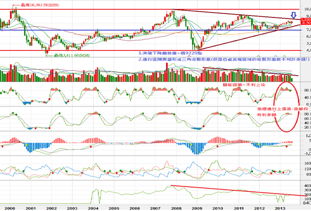 除非台股能夠出現(形成突破型態)也就帶量的突破長天期的下降趨勢線(也就是9220反壓點)